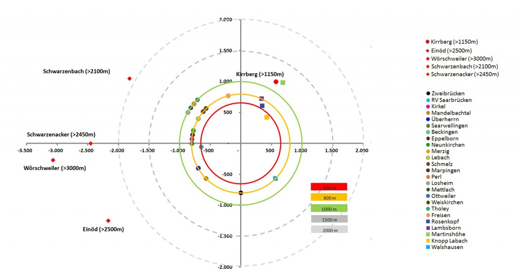 Die folgende Abbildung zeigt die Abstände zu den umliegenden Ortsteilen Kirrberg, Einöd, Schwarzenbach und Schwarzenacker, sowie zum Universitätsklinikum Homburg. Diese sind deutlich größer als dies rechtlich zur Einhaltung der Grenzwerte erforderlich wäre.