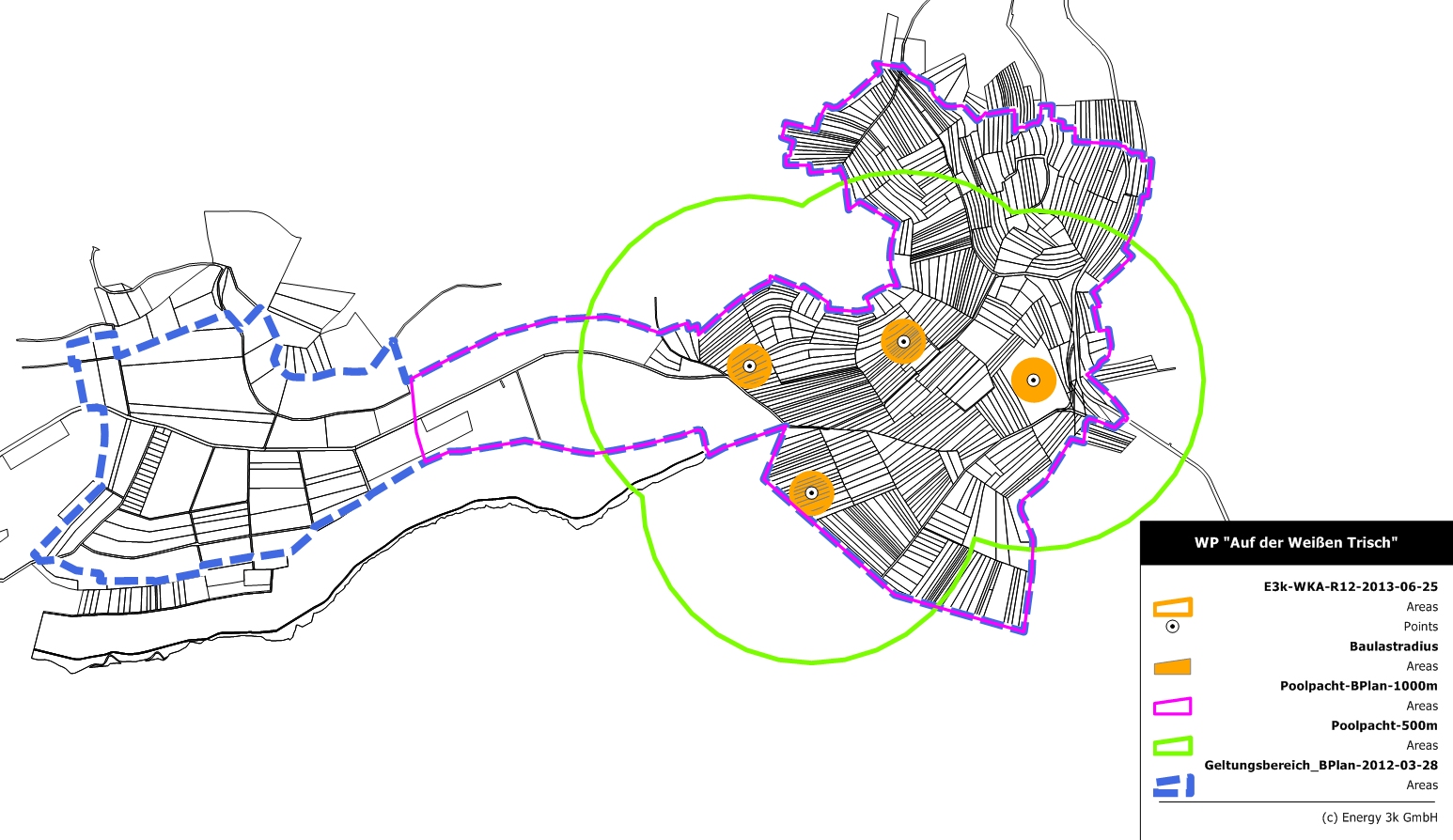 Die Festlegung der Gesamtfläche des Windparks kann nach verschiedenen Kriterien erfolgen. Die Graphik rechts zeigt 3 mögliche Flächenkulissen. Die grün umrandetete ergibt sich, wenn um die geplanten Anlagen alle Flächen im Umkreis von 500 m einbezogen werden. Die blau umrandete Fläche entspricht dem Geltungsbereich des Bebauungsplans in Aufstellung, Die lila berandete Fläche ergibt sich, wenn man den Bebauungsplan um alle Fläche reduziert, welche weiter als 1000 m von den Windkraftanlagen entfernt liegen.