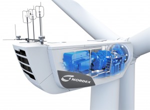 Als Generator kommt eine doppelt gespeiste Asynchronmaschine zum Einsatz. Diese Generatorart setzt Nordex bereits seit Jahren mit Erfolg bei drehzahlvariablen Anlagen ein. Wesentlicher Vorteil: Nur 25 bis 30 % der erzeugten Energie müssen über einen Umrichter in das Stromnetz eingespeist werden. Damit senkt der Einbau dieses Generator/ Umrichter-Systems die Gesamtkosten der Windenergieanlage.